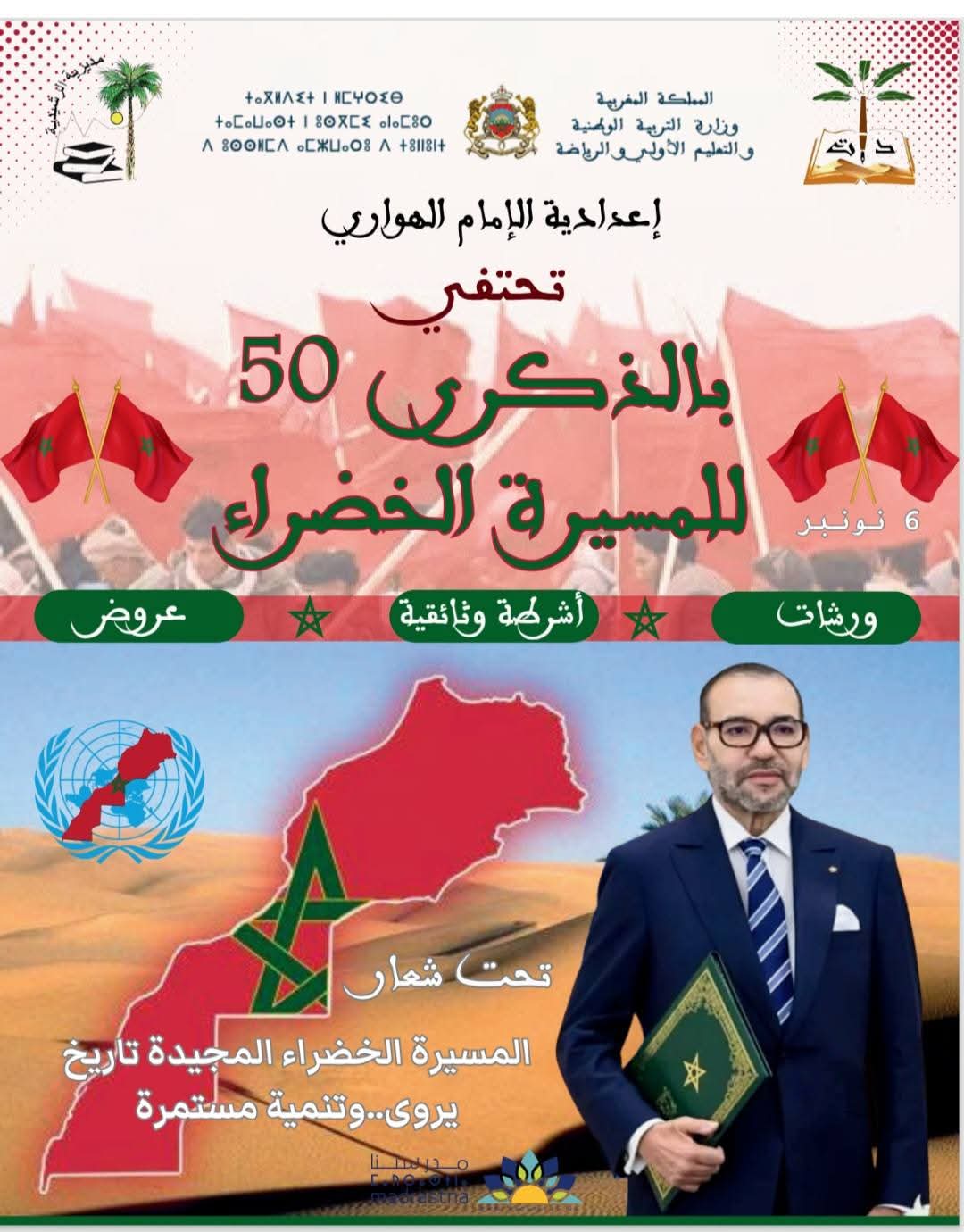 في إطار الاحتفال بذكرى المسيرة الخضراء والتي تزامنت وتكريس الوحدة الترابية المغربية وإضفائها الشرعية القانونية والسياسية في إطار الحكم الذاتي ووفق قرار مجلس الدولي 2797نظمت اعدادية الإمام الهواري الإعدادية أمسية فنية يوم الجمعة 7 نونبر 2025 تضمن: النشيد الوطني
