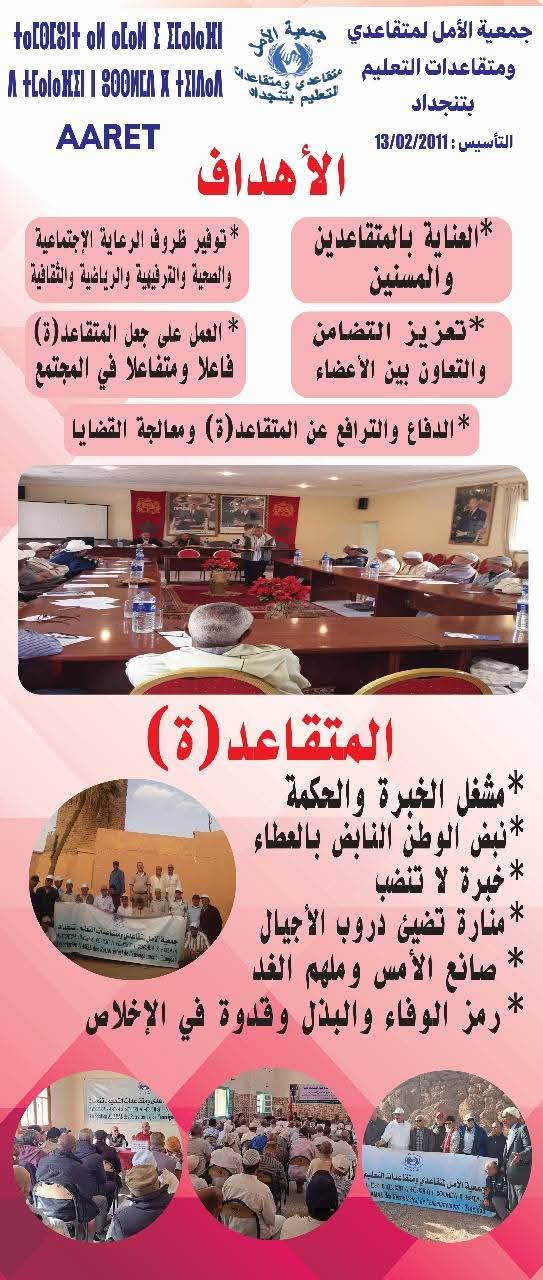 تتشرف جمعية الأمل لمتقاعدي ومتقاعدات التعليم بتنجداد، بدعوتكم لحضور أشغال الندوة العلمية في موضوع ” الشيخوخة و الصحة العامة “. من تأطير الذكتور:راشيدي المصطفى. – المندوب الإقليمي لوزارة الصحة والحماية الاجتماعية بالرشيدية سابقا. و مشاركة المسؤول عن الوحدة الجهوية لمؤسسة محمد السادس للنهوض بالأعمال الاجتماعية للتربية و التكوين بالرشيدية. و المندوبية الجهوية للصندوق المغربي للتقاعد. وذلك يوم السبت 15 نونبر 2025 .على الساعة التاسعة والنصف صباحا بقاعة الاجتماعات بدار الطالب بتنجداد.